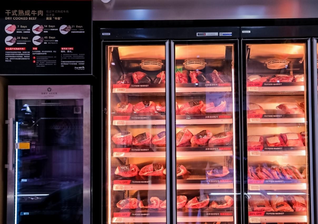 此外, T11在线下卖场里首家提供免费干式熟成加工服务:用户购买整块牛肉后,可寄放在卖场内定制的进口熟成柜子,经过30至45天干式熟成发酵,可在店内享用,或带走自行加工。发酵后的牛肉会变得更多汁且蕴含淡淡的果香和乳酪香味、入口即化。这种专业发酵方式在超市中并不多见,通常只会在高档的西餐厅中出现。