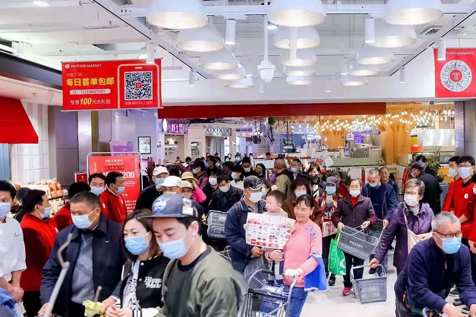4月16日上午9点,位于古北1699 B2层的T11生鲜超市门口已经挤满了人,为了限制人流,超市的门口还拉起了隔离带,并安排了保进行现场管理,以确保大家能够有序入场。
